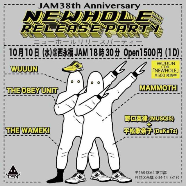 "JAM 38th Anniversary NEWHOLE release party" @À¾±ÊÊ¡JAM ¢©168-0064 ÅìµþÅÔ¿ùʶè±ÊÊ¡3-34-14¡ÊB1F¡Ë jam.rinky.info St 18:30 ¥1500¡Ê¡Ü1d¡Ë WUUUN MAMMOTH THE WAMEKI THE OBEY UNIT Ìî¸ý±ÑΧ(MUSQIS) + Ê¿¾¾²ÎÆà»Ò(DaKaTz)
