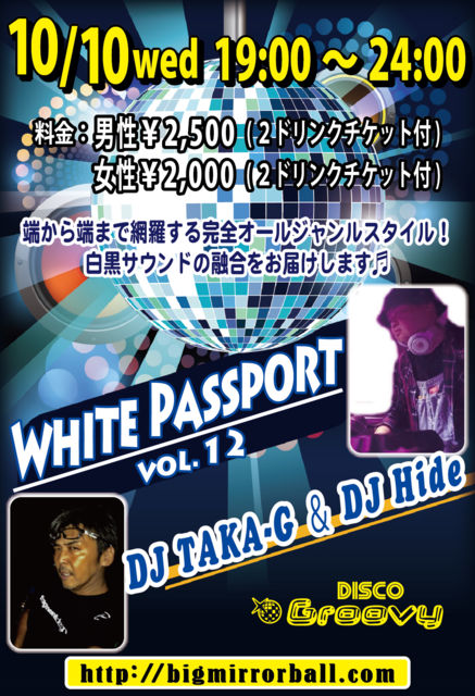¡ÚWHITE PASSPORT¡Û¤Þ¤Ã¤µ¤é¤Ê¥Ñ¥¹¥Ý¡¼¥È¤¬¥¹¥¿¥ó¥×¤Ç¤¤¤Ã¤Ñ¤¤¤Ë¤Ê¤Ã¤Æ¤¤¤¯¤è¤¦¤Ë¡¢³§ÍͤÎÂÀפÇËä¤á¿Ô¤¯¤·¤Æ¤¤¤¤¿¤¤¡£¤½¤ó¤Ê»×¤¤¤Ç¥¹¥¿¡¼¥È¤·¤Þ¤·¤¿¥¤¥Ù¥ó¥È¤Î vol.12 ¤Ç¤¹¡ª ü¤«¤éü¤Þ¤ÇÌÖÍ夹¤ë´°Á´¥ª¡¼¥ë¥¸¥ã¥ó¥ëSTYLE♬ Çò¹õ¥µ¥¦¥ó¥É¤ÎÍ»¹ç¤òËè·îÂ裲¿åÍËÆü¤Ë¤ªÆÏ¤±¤·¤Þ¤¹¡ù ¡ÚDJ¡Û TAKA-G / Hide ¡Ú²»³Ú¡Û ¥ª¡¼¥ë¥¸¥ã¥ó¥ë / ¥ª¡¼¥ë¥ß¥Ã¥¯¥¹ ¡Ú³«ºÅ»þ´Ö¡Û 19:00¡Á24:00 ¡ÚÎÁ¶â¡Û ÃËÀ¡§¡ï2,500 / 2Drinks ½÷À¡§¡ï2,000 / 2Drinks