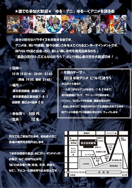 ´ÉÍý¼ÔÍÍ ¥¹¥Ú¡¼¥¹¤ò¤ª¼Ú¤ê¤¤¤¿¤·¤Þ¤¹¡£ ¡Ö¤æ¤ë¡ù¥¢¥Ë¡×¤Ï¡¢¥¢¥Ë¥á¤ä¥Þ¥ó¥¬¤ò¤æ¤ë¡Á¤¯¸ì¤ê¹ç¤¤¡¢¼«Ê¬¤Î¹¥¤¤Ê¤³¤È¤ò¶¦Í¤¹¤ë²ñ¤Ç¤¹¡£ Ëè²ó¥Æ¡¼¥Þ¤¬·è¤Þ¤Ã¤Æ¤ª¤ê¡¢¤½¤Î¥Æ¡¼¥Þ¤Ë¤Ä¤¤¤Æ¡¢¥Õ¥ê¡¼¥È¡¼¥¯¤Ç²ñÏäò¿Ê¤á¤Þ¤¹¡£ PC¡¦¥×¥í¥¸¥§¥¯¥¿¤òÍѰդ·¤Æ¤¤¤Þ¤¹¤Î¤Ç¡¢¥¢¥Ë¥á¡¦ÈÖÁȤòÃΤé¤Ê¤¯¤Æ¤âÏÃÂê¤ò¶¦Í¤Ç¤¤Þ¤¹¡£ ¥¢¥Ë¥á¤Ï¡¢¾Ð¤¤¤ä´¶Æ°¡¢ÍÍ¡¹¤Ê³Ú¤·¤µ¤òÍ¿¤¨¤Æ¤¯¤ì¤ë¥¨¥ó¥¿¡¼¥Æ¥¤¥ó¥á¥ó¥È¤Ç¤¹¡£ ÃΤé¤Ê¤¤ºîÉʤȽвñ¤Ã¤¿¤ê¡¢¿·¤·¤¤³Ú¤·¤ßÊý¤âȯ¸«½ÐÍè¤ë¤«¤â¢ö ¡ÖºÇ¶á¤Îή¹Ô¤ê¤Ã¤Æ¤É¤ó¤Ê¤Î¤À¤í¤¦¡©¡×¤È¤¤¤¦½é¿´¼Ô¤ÎÊý¤âÂç´¿·Þ¤Ç¤¹¡ª ¢£Æü