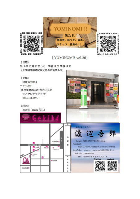 ¼¡²óLIVE¤Î¤ªÃΤ餻¤Ç¤¹¡£ º£²ó¤ÎYOMINOMI¡¢²ñ¾ì¤Ï¡ÖÃÓÂÞGEKIBA¡×¤Ë¤Ê¤ê¤Þ¤¹¡£ ºîÉʤϡ¢ ÃæÃ«±§µÈϺ¡Ö¥µ¥é¥À¤ÎÆæ¡× ¤ò¤ä¤ê¤Þ¤¹¡£ ¤è¤í¤·¤¯¤ª´ê¤¤¤¤¤¿¤·¤Þ¤¹¡£