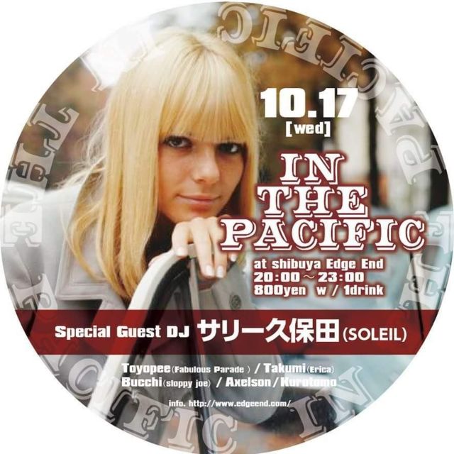 ¡ÚIn The Pacific 139¡Û 2018/10/17¡ÊWed¡Ë ¡÷½ÂëEdge End¡¡http://www.edgeend.com/ 20¡§00¡Á23¡§00¡¡800yen w/1d DJs¡§ ¡¡Toyopee¡ÊFabulous Parade ¡Ë ¡¡Takumi¡ÊErica¡Ë ¡¡Bucchi¡Êsloppy joe¡Ë ¡¡kurotomo Axelson Special Guest DJ¡§ ¥µ¥ê¡¼µ×ÊÝÅÄ¡ÊSOLEIL¡Ë ********************************************** º£·î¤Î¥²¥¹¥È¤Ïº£¤äSOLEIL¤ÇÂç¿Íµ¤¡¢2ÅÙÌܤÎÅо쥵¥ê¡¼µ×ÊÝÅĤµ¤ó¤Ç¤¹¡ª À§Èó¤È¤âÍ·¤Ó¤ËÍè¤Æ¤¯¤À¤µ¤¤¡£¥ì¥®¥å¥é¡¼DJ¶¦¡¹¤ªÂÔ¤Á¤·¤Æ¤ª¤ê¤Þ¤¹¡ª