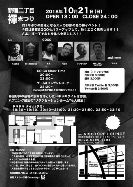 ´ÉÍý¿ÍÍÍ¡¢ÀëÅÁ¤µ¤»¤Æ¤¤¤¿¤À¤¤Þ¤¹¡£ÉÔÅÔ¹ç¤Ê¾ì¹ç¤Ïºï½ü´ê¤¤¤Þ¤¹¡£Ï»¼Ü¡¦ê¥Ù¥ó¥È¤ò¾Ò²ð¤µ¤»¤Æ¤¤¤¿¤À¤¤Þ¤¹¡£ º£²ó¤â¤æ¤¦¤¿¤¬¤ª¼êÅÁ¤¤¤ò¤·¤Þ¤¹¡£ ¤¼¤Ò¡¢¤¤¤é¤·¤Æ²¼¤µ¤¤¡£¤ªÂÔ¤Á¤·¤Æ¤¤¤Þ¤¹¡£ ¡¡ ¡Ö¿·½ÉÆóÃúÌÜ êî¤Þ¤Ä¤ê¡× Æü»þ: 10/21 (Æü) 18:00¡Á24:00 ¾ì½ê: AiSOTOPE LOUNGE ¿·½É¶è¿·½É2-12-16 ¥»¥¤¥ó¥È¥Õ¥©¡¼¥Ó¥ë1F 03(6380)1504 ÎÁ¶â(1DÉÕ¤): Ï»¼ÜÉÕ¤3,500±ß¡¢Ä̾ï 3,000±ß¡¢Ï»¼ÜÉÕ¤Twitter³ä 3,000±ß¡¢Twitter³ä 2,500±ß DJ:Asako,M¡ùNature GOGO:ͦÂÀ¡¢Gen¡¢¥æ¥¦¥¿¡¢¥±¥ó¥¿¥í¥¦¡¢MACHIU ÆÃÊ̶¨»¿Å¹: Base¡¢¤Î¤é¢