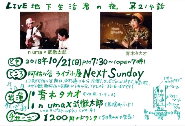 2018ǯ¡ü10·î21Æü(Æü) Ìë7»þȾ¡Á¡ÖÃϲ¼À¸³è¼Ô¤ÎÌë¡¡Âè21£´Ïá׽©Ãϲ¼ ¡¡ ¾ì½ê¡Û¥é¥¤¥Ö¾®²°¡¢°¤º´¥öë Next Sunday ¤Ë¤Æ¡¡http://nextsunday.jp/ (JR°¤º´¥öëÆî¸ý¡¢Ãæ¿ùÄ̤ê4ʬº¸Â¦¡£¥³¥ó¥Ó¥Ë¡Ö£í£é£î£é¥Ô¥¢¥´¡×¼êÁ°B1TEL03-3316-6799)¡¡¥Þ¥Ã¥× 1200±ß+¥É¥ê¥ó¥¯ OPEN 19:00¡¿START 19:30 ½Ð±é¡üÀÄÌÚ¥¿¥«¥ª¡¡¡ün uma¡ßÉðŰÂÀϺ¡ÊÇ϶ôÄ®¥Ð¥ó¥É)