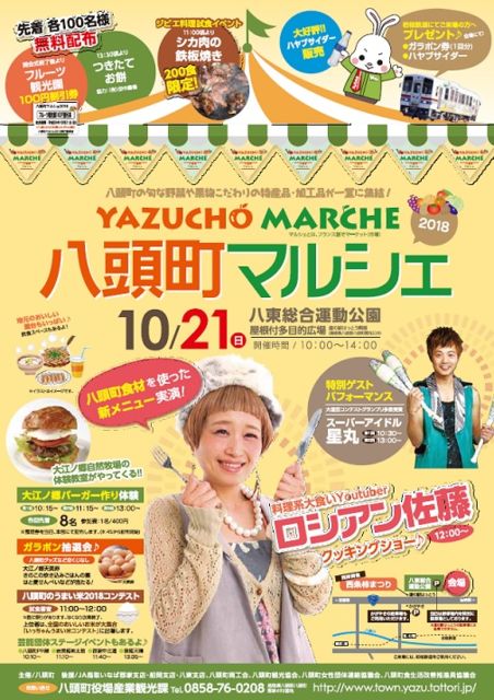 奥村隼也さんがイヴェントに出演いたします。 『八頭町マルシェ2018』 【日時】 2018年10月21日(日)10時〜14時 【会場】 八東総合運動公園 (道の駅はっとう 隣接) 鳥取県八頭郡八頭町徳丸528 【出演】 奥村隼也(MC) 他