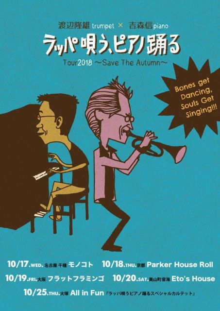 ¢¡10/25(ÌÚ) ¡Ô½Ë¡ªAll in Fun 10¼þǯ¡Õ ¡Ø¥é¥Ã¥Ñ±´¤¦¥Ô¥¢¥ÎÍÙ¤ë ¡¡¥¹¥Ú¥·¥ã¥ë¥«¥ë¥Æ¥Ã¥È¡ª¡Ù ---------------------------- ÅÏÊÕδͺtrumpet µÈ¿¹¿®piano ÁáÀî³ÙÀ²contrabass ˧³À°ÂÍÎdrums ---------------------------- ÂçÄÍAll in Fun http://allinfun.jp/index.php 03-3987-6242 18:30open/19:30start ͽÌó \3,000 ÅöÆü \3,500 ****************** ¡ùÅÏÊÕδͺ¤µ¤ó¤Îfacebook ¤è¤ê¡ª https://www.facebook.com/takao.watanabe.754 ¢ ÌÀÆü¤Ï°ìÌë¸Â¤ê¤ÎÆÃÊ̤ÊÌë ¤½¤ì¤¾¤ì¿¼¤¤´Ø¤ï¤ê¤Ï¤¢¤ì¤É¡¢ ¤³¤Î4¿Í¤Ç¤Ï½é´é¹ç¤ï¤»
