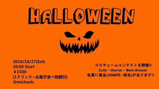 トリックオアトリート🎃 お菓子あげるからイタズラさせて❤️ ということでマイケルズ二階でハロウィンパーティーを開催します♪ みなさん久しぶりにマイケルズで飲みませんか? ガチ仮装でエントリーするもよし! いつもの服装にワンポイントでもよし! 今回イカした仮装をした方には豪華賞品があります! 金額はお菓子食べ放題ワンドリンク付きで 1500円。 ご家族ご近所お誘い合わせの上ぜひ お越しください。