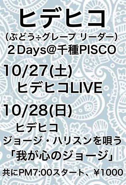 10·î28Æü(Æü) °¦Ãθ© ̾¸Å²° Àé¼ï PISCO https://goo.gl/E4Mjrk ¡Ö¥Ò¥Ç¥Ò¥³¡¢¥¸¥ç¡¼¥¸¥Ï¥ê¥½¥ó¤ò±´¤¦ ¡Á²æ¤¬¿´¤Î¥¸¥ç¡¼¥¸¡Á ¥Ò¥Ç¥Ò¥³ÃƤ¸ì¤ê 2days at PISCO¡× ½Ð±é:¥Ò¥Ç¥Ò¥³(±Ê°æ½¨É§) open18:00 start19:00¡¡¥Á¥ã¡¼¥¸1000±ß +1DRINK