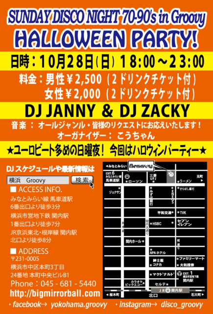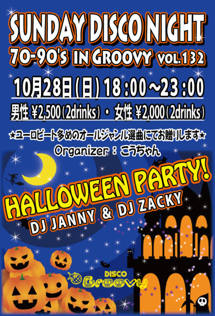 ¡ÚSUNDAY DISCO NIGHT 70¡Á90's in Groovy vol.132¡Û Â裴¤ÎÆüÍËÆü¤Ë³«ºÅ¤È¤Ê¤ê¤Þ¤¹¡ÚSUNDAY DISCO NIGHT¡ÛÆüÍËÆü¤Ë¤·¤«¤ª½Ð¤«¤±¤Ç¤¤Ê¤¤Êý¡¹¤Ê¤É¡¢µÙÆü¤Ç¤âDISCO¤ÊNIGHT¤ò¸ʬ¤Ë¤ª³Ú¤·¤ß¤¤¤¿¤À¤±¤Þ¤¹(^_-)-¡ù♬ º£²ó¤Ï¥Ï¥í¥¦¥£¥ó¥Ñ¡¼¥Æ¥£¡¼¤Ç¤¹¡ª ¡Ú¥ª¡¼¥¬¥Ê¥¤¥¶¡¼¡Û¤³¤¦¤Á¤ã¤ó ¡ÚDJ's¡Û JANNY / ZACKY ¡Ú²»³Ú¡Û¥æ¡¼¥í¥Ó¡¼¥È¿¤á¥ª¡¼¥ë¥¸¥ã¥ó¥ë ¡ÊSOUL¡¢Ãݤλҡ¢HI-NRG¡¢R&B¡¢etc... ³§ÍͤΥꥯ¥¨¥¹¥È¤Ë¤ª±þ¤¨¤·¤Þ¤¹¡ª¡Ë ¡Ú³«ºÅ»þ´Ö¡Û18:00¡Á23:00 ¡ÚÎÁ¶â¡Û ÃËÀ¡§¡ï2,500 / 2Drinks ½÷À¡§¡ï2,000 / 2Drinks