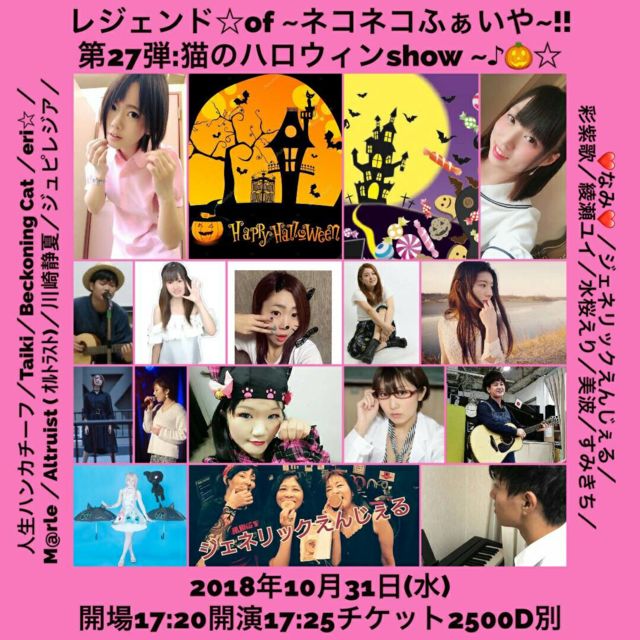 ¢£2018ǯ10·î31Æü(¿å)¡Ö¥ì¥¸¥§¥ó¥É¡ùof ~¥Í¥³¥Í¥³¤Õ¤¡¤¤¤ä~!!Âè27ÃÆ:Ç¤Î¥Ï¥í¥¦¥£¥óshow ~¢ö¡ù¡× ÅìÃæÌîmusic shed yes! (ÅìµþÅÔÃæÌî¶èÅìÃæÌ¡Ý£µ£¶¡Ý£¸¡¡ÆüÀ¸¥Ó¥ë£²F¡Ë ³«¾ì:17:20 ³«±é:17:25 ¥Á¥±¥Ã¥È:2500ÊÌD ¡17:25~17:30 ¿·À¤µªT¡ùNY ¢17:30~17:55 ¿ÍÀ¸¥Ï¥ó¥«¥Á¡¼¥Õ £17:55¡Á18:20 Taiki ¤18:20¡Á18:40 Beckoning Cat ¥18:40¡Á19:00 Eri ¦19:00~19:20 M@rle §19:20¡Á19:45 Altruist ( ޵ŽÙŽÄŽ×޽ŽÄ) ¨19:45~20:05 ÀîºêÀÅ²Æ ©20:05~20:25 ¥¸¥å¥Ô¥ì¥¸¥¢ ª20:25~20:45 ¤Ê¤ß «20:45~