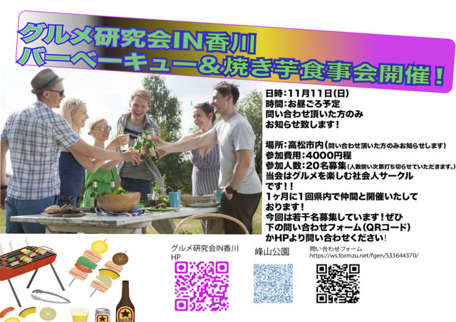 こんにちは! グルメ研究会IN香川のDAIGOと申します! グルメ研究会では、バーベーキューを開催致します顔(笑) 秋の昼の空の下、楽しい食事会を満喫いただきたいとの思いから 急遽開催致します! ぜひ皆様奮ってご参加ください! 場所は問い合わせ頂いた方のみお知らせいたします! 問い合わせHP http://gourmet-kagawa.club/RE/