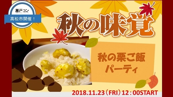 ■今回のコンセプトについて ・秋らしく、野外で栗ご飯パーティーを開催致します! ・ちょうどいい年の差(男性24歳〜38歳/女性22歳〜36歳)の男女を集めた形式で開催! ・出来たてホクホクの栗ご飯を食べましょう♪ ■開催会場様の情報 会場名:御山公園 住所:香川県高松市牟礼町牟礼1355番地1 ■当日のタイムスケジュール 11:30〜12:00 受付店舗での受付 (※時間に余裕をもってお越し下さい) ↓ 12:00〜 イベントスタート (※一斉に乾杯を行います) ↓ 12:30〜 席替え等 (※時間毎に席替えを
