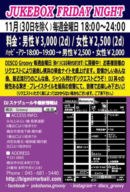 ★お客様からのリクエストにて選曲するイベント:JUKEBOX FRIDAY NIGHT★ 昔懐かしいあんな曲、最近流行りのこんな曲、ジャンル問わずリクエストをどうぞ! DJそれぞれのプレイスタイルを皆様でどうぞお楽しみ下さい♬ 【音楽】オールジャンル(リクエスト優先) Soul、Funk、Dance Classics、HipHop、R&B、EDM、Euro、etc... 【開催時間】 18:00〜24:00 【ハッピーアワー料金 / 18:00〜19:00にご来店の方】 男性:¥2,500 / 2Drinks 女性:¥2,000 / 2Drinks 【料金 / 19:00以降ご来店の方】 男性:¥3,000 / 2Drinks 女