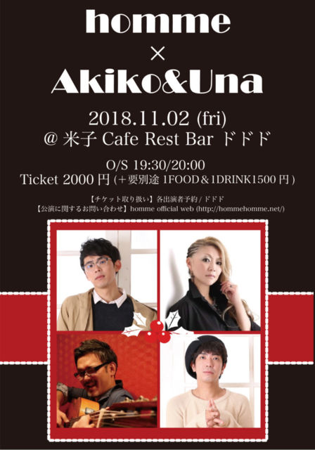 11/2(fri)CafeRestBarドドド(鳥取県米子市) homme×Akiko&Unaスペシャルライブ <CAST> homme Akiko&Una O/S 19:30/20:00 Ticket 2000yen(別途1drink+1food代1500yen必要) 2マンライブ! 座席数に限りがあるので、ご予約はお早めに! チケット予約は、メール件名に「チケット予約」、本文に「公演日・カタカナフルネーム・枚数」を明記の上、hommehomme777@gmail.comまで。