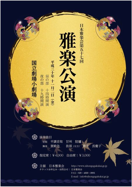 第1部 日本雅楽会第57回雅楽公演 平成30年11月2日(金) 昼の部14:00開演 夜の部19:00開演 *昼夜2回公演 内容は同一です *終演予定は昼の部15:50、夜の部20:50です。 会 場 国立劇場小劇場 演 目 第一部 管絃 平調音取・甘州・陪臚 第二部 舞楽 賀殿急・抜頭(左方)・敷手・長慶子 入場料 指定席¥4,000 自由席¥3,000 (出演者優待で500円引きで購入出来ますので 希望者は別途ご連絡ください) http://www.nihongagakukai.gr.jp/concert/latest.html 第一部は特に集合は設けていません。