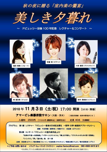 没後100年で今年各地で演奏されているドビュッシー。そのソロ・デュオ曲に限定した代表的作品を取り上げ、資料テキストとともにドビュッシー楽曲の本質について対談を交えてトークするレクチャー付きコンサートを実施します。 参加者は前半のレクチャー、豊富な資料テキストだけでもきっと参考になることと思います。後半のコンサートを含めてドビュッシーの音楽の真髄をご堪能ください。 日時 2018年11月3日 土曜日 17時開演 会場 アマービレ楽器特設サロン(大阪・茨木市総持寺駅前) 参加費 2500円 (講義・資料代含む) 定員 40名 (先着順
