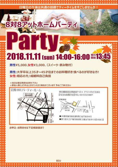 £¸ÂУ¸¡÷¥Û¡¼¥à¥Ñ¡¼¥Æ¥£¡¼11·î11Æü(Æü) Æü»þ 2018ǯ11·î11Æü(Æü)¡¡14:00¡Á16:00¡Ê¼õÉÕ13:45¡Á¡Ë ¾ì½ê BIU¥Ñ¡¼¥Æ¥£¡¼¥ë¡¼¥à¡Ê¿·½É¶è¡Ë »²²ÃÈñ ÃËÀ¡§\5000¡¡½÷À¡§\3000 ÂÐ¾Ý ÃËÀ¡§35¡Á45ºÍ°Ì¤Þ¤Ç¤ÎÂ細ʾå¤ÎÊý¡¡¤ªÎÁÍý¹¥¤¡ª¿©¤Ù¤ë¤Î¤¬¹¥¤¡ª¤ÊÊý ½÷À¡§Áê±þ¤ÎÊý¡ÊÀ®º§ÎÁ¼«¸ÊÉéô¡Ë Äê°÷¿ô ÃËÀ8̾ ½÷À8̾ ÆâÍÆ ÈþÌ£¤·¤¤¤ªÎÁÍý¤ò¿©¤Ù¤ë»þ¡¢¡ÖÈþÌ£¤·¤¤¡Á¡ª¡×¤Ã¤Æ¶¦´¶¤¹¤ëÊý¤¬Î٤ˤ¤¤ë¤È¤è¤ê³Ú¤·¤¤¤Ç¤¹¤è¤Í¢ö °ì½ï¤ËÈþÌ£¤·¤¤¤â¤Î¤ò¿©¤Ù¤Ë½Ð¤«¤±¤¿¤ê¡¢°ì½ï¤Ë¤ªÎÁÍý¤òºî¤Ã¤¿¤ê¡¢»þ¤Ë¤ÏÏÓ¤ò¿¶¤ë¤Ã¤Æ¤´ÃÚÁö¤·¤¿¤ê¡Ä¡£ ¿©¤Ù¤ë¤³¤È¤¬¹¥¤¤ÊÃËÀ¤È¡¢