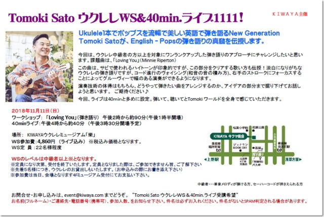 Ukulele£±Ëܤǥݥåץ¹¤òήΤ«¤ÄÈþ¤·¤¤±Ñ¸ì¤ÇÃÆ¤¸ì¤ëNew Generation Tomoki Sato¤¬¡¢ English-Pops¤ÎÃÆ¤¸ì¤ê¤Î¿¿¿ñ¤òÅÁ¼ø¤·¤Þ¤¹¡£ º£²ó¤Ï¡¢¥¦¥¯¥ì¥ìÃæµé¼Ô¤ÎÊý°Ê¾å¤òÂоݤ˥ï¥ó¥é¥ó¥¯¥¢¥Ã¥×¤·¤¿ÃƤ¸ì¤ê¤Î¥¢¥×¥í¡¼¥Á¤Ë ¥Á¥ã¥ì¥ó¥¸¡£²ÝÂê¶Ê¤Ï¡¢¡ÖLoving You¡×¡ÊMinnie Riperton¡Ë¡¡ ¤³¤Î¶Ê¤Ï¡¢¥µ¥Ó¤Ç»È¤ï¤ì¤ë¥Ï¥¤¥È¡¼¥ó¤¬°õ¾ÝŪ¤Ç¤¹¤¬¡¢¤³¤ÎÉôʬ¤ò¥¯¥ê¥¢¤¹¤ë²Î¤¤Êý¤âÅÁ¼ø¡ª øÇò¤Ë¤Ê¤ê¤¬¤Á¤Ê¥¦¥¯¥ì¥ì¤ÎÃÆ¤¸ì¤ê¤Ç¤¹¤¬¡¢¥³¡¼¥É¿Ê¹Ô¤Î¥ô¥©¥¤¥·¥ó¥°(ϲ»¤Î²»¤ÎÀѤßÊý)¡¢ ±¦¼ê¤Î¥¹¥È¥í¡¼¥¯¤Ë¥Õ¥©¡¼¥«¥¹¤¹¤ë¤³¤È¤Ë¤è¤Ã¤Æ¥°¥ë¡¼¥ô¥£¡¼¤ÇÉý¤Î¤¢¤ë±é