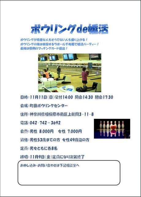 ¥Ü¥¦¥ê¥ó¥° de º§³è Æü»þ 2018ǯ11·î11Æü(Æü) ¼õÉÕ14:00¡Á¡¡¥Ü¥¦¥ê¥ó¥°14:30¡Á¡¡Ê̼¼¤Ë¤Æ¥Ñ¡¼¥Æ¥£¡¼16:00¡Á17:30 ¾ì½ê Ä®Åĥܥ¦¥ê¥ó¥°¥»¥ó¥¿¡¼¡ÊJRÄ®ÅıØÅÌÊâ3ʬ¡Ë »²²ÃÈñ ÃËÀ¡§8,000±ß¡¡½÷À¡§7,000±ß »ñ³Ê ÃËÀ¡§53ºÐ¤Þ¤Ç¤ÎÊý¡¡½÷À¡§49ºÐ¤Þ¤Ç¤ÎÊý Äê°÷¿ô ÃËÀ¡§8̾¡¡½÷À¡§8̾ ÆâÍÆ ½©¤Ï¥¹¥Ý¡¼¥Ä¤Îµ¨Àá¡¢11·î11Æü¤Ï1¡¤1¡¤1¡¤1¤Ç¥Ü¡¼¥ê¥ó¥°¥Ô¥ó¤ÎÆü¡£ ¥Á¡¼¥àÀï¤Ç¥ï¥¤¥ï¥¤Í·¤ó¤À¸å¤ÏÊ̼¼¤Ë¤Æ¡¢É½¾´¼°¤â´Þ¤á¤Æ½Ð²ñ¤¤¤Î¥Ñ¡¼¥Æ¥£¡¼¡£ ¥Ü¡¼¥ê¥ó¥°¤Ï½é¤á¤Æ¤Ç¤â¡¢ÆÀ°Õ¤Ç¤Ê¤¯¤Æ¤â¤«¤Þ¤¤¤Þ¤»¤ó¡£ ¿ÈÂΤòư¤«¤¹¤³¤È¤¬¹¥¤¤ÊÊý¤Ç¤¢¤ì¤ÐÂç´¿·Þ¡ªÅöÆü¤Ï