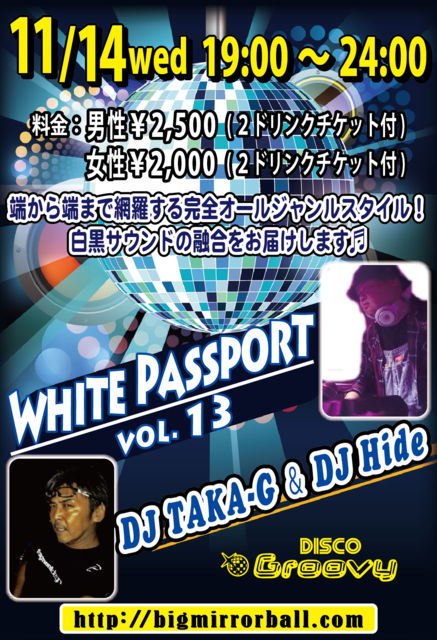 ¡ÚWHITE PASSPORT¡Û¤Þ¤Ã¤µ¤é¤Ê¥Ñ¥¹¥Ý¡¼¥È¤¬¥¹¥¿¥ó¥×¤Ç¤¤¤Ã¤Ñ¤¤¤Ë¤Ê¤Ã¤Æ¤¤¤¯¤è¤¦¤Ë¡¢³§ÍͤÎÂÀפÇËä¤á¿Ô¤¯¤·¤Æ¤¤¤¤¿¤¤¡£¤½¤ó¤Ê»×¤¤¤Ç¥¹¥¿¡¼¥È¤·¤Þ¤·¤¿¥¤¥Ù¥ó¥È¤Î vol.13 ¤Ç¤¹¡ª ü¤«¤éü¤Þ¤ÇÌÖÍ夹¤ë´°Á´¥ª¡¼¥ë¥¸¥ã¥ó¥ëSTYLE♬ Çò¹õ¥µ¥¦¥ó¥É¤ÎÍ»¹ç¤òËè·îÂ裲¿åÍËÆü¤Ë¤ªÆÏ¤±¤·¤Þ¤¹¡ù ¡ÚDJ¡Û TAKA-G / Hide ¡Ú²»³Ú¡Û ¥ª¡¼¥ë¥¸¥ã¥ó¥ë / ¥ª¡¼¥ë¥ß¥Ã¥¯¥¹ ¡Ú³«ºÅ»þ´Ö¡Û 19:00¡Á24:00 ¡ÚÎÁ¶â¡Û ÃËÀ¡§¡ï2,500 / 2Drinks ½÷À¡§¡ï2,000 / 2Drinks