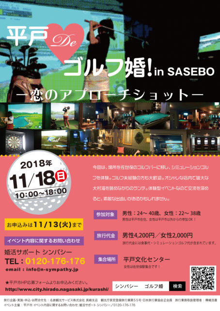 平戸市主催イベント 第2弾!! 「平戸DEゴルフ婚! in SASEBO 〜恋のアプローチショット〜」が開催されます♪(前回のクルーズ婚では、7組のカップルが誕生しました☆) 今回は、場所を佐世保の大人気のゴルフバーに移し、シミュレーションゴルフを体験。ゴルフ未経験の方も盛り上がれます♪ 体験しながらのイベントなので、無理せず会話できるのがポイント! ランチでは、店主自慢の本場のバーベキュー料理がいただけます♪ また、店内から眺める大村湾は絶景でした☆ イベント主催:平戸市 イベント内容に関するお問い合わせ:婚