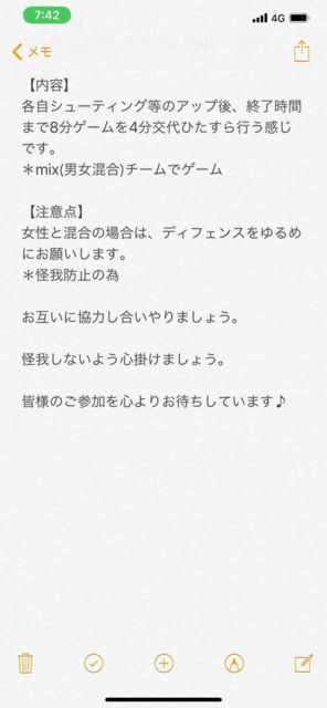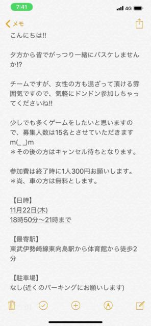 練習予定でしたが人数が若干足りないので、 練習に来て下さる方を募集します。 人数が揃うまで各自アップをして、 あとはずっとゲー ムを続けます。 時間が短い為、募集は4名程度とさせて頂きます。 (自チームのメンバーは10人くらいです。) ※状況により募集人数に達する前に締め切る事もありますのでご了承ください。 【注意事項】 チーム分けに使いますので濃淡の着替えをお持ちください。 ボールの貸し出しはありませんのでご持参下さい。 自転車・バイク等は入り口横の駐輪場をご利用下さい 。 車で来る方はお近くの