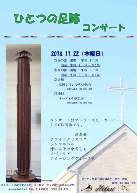 ひとつの足跡コンサート プレクリスマス 日にち✴11月22日(木) 時 間✴昼の部 13:30〜15:30 夜の部 18:30〜20:30 (開場は開演の30分前からです) 内 容✴オーディオ夢工房の全方位型スピーカー 『諒』を使用してCD鑑賞会 曲目はアベマリア、アメージンググレース、他クリスマス今日など 昼と夜、同じ内容です。 どなたでも参加できます。教会に駐車スペース数台あり、小さな教会です。椅子の準備しますので、参加はメッセージくれると助かります^_^ す