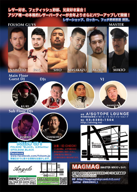 ³§¤µ¤ó¡¢¤ªÂÔ¤¿¤»¤·¤Þ¤·¤¿¡£ Â繥ɾ¤Ç¤·¤¿Á°²ó£³·î¤Ë°ú¤Â³¤¡¢FOLSOM BLACK ¤òAiSOTOPE LOUNGE ¤Ë¤Æ³«ºÅ¤¤¤¿¤·¤Þ¤¹¡£ ¥¢¥¸¥¢Í£°ì¤ÎËܳÊŪ¥ì¥¶¡¼¥Ñ¡¼¥Æ¥£¡¼ FOLSOM BLACK ºòǯ¤Ë°ú¤Â³¤¡¢¤µ¤é¤Ë¥Ñ¥ï¡¼¥¢¥Ã¥×¤·¤Æ¤Î¥ª¡¼¥ë¥Ê¥¤¥È³«ºÅ¡ª º£¤Þ¤Ç°Ê¾å¤ËÄ«¤Þ¤ÇÀ¹¤ê¾å¤¬¤í¤¦¤¼¡ª º£²ó¤Ï Main Guest DJ ¤Ë KURI ¤È Sub Floor DJs ¤Ë POPPO / YAMAKAWA ¤È Main Floor VJ ¤Ë naomixx ¤ò ¤Þ¤¿¡¢FOLSOM GUYS ¤È¤·¤Æ NAWOTO ¤È PAG ¤È SHO ¤ò·Þ¤¨¡¢ FOLSOM GUYS¤Ë¤è¤ë¤ª¤â¤Æ¤Ê¤·¤Ê¤É¤Ê¤É¡¢À¹¤ê¤À¤¯¤µ¤ó¡£ ¥ì¥¶¡¼¡¢¥é¥Ð¡¼¡õ¥Õ¥§¥Æ¥£¥Ã¥·¥åÌîϺ¡¢·»µ®¹¥¤½¸