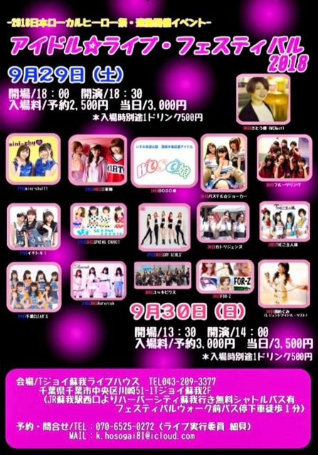 ¡Ú¥¢¥¤¥É¥ë¡ù¥é¥¤¥Ö¡¦¥Õ¥§¥¹¥Æ¥£¥Ð¥ë¡Û ¢£Æü»þ/2018ǯ11·î25Æü(Æü) 13:30³«¾ì¡¢14:00³«±é ¢£½Ð±é/¤µ¤È¤¦Í¥(MC&ACT) BOSO̼ ¥Õ¥ë¡¼¥Ä¥ê¥ó¥° Asterisk »°»ÑÉñ ¥Ñ¥¹¥Æ¥ë¡ù¥¸¥ç¡¼¥«¡¼ THE¤´¼ç¿ÍÍÍ SKY GIRLS' ¸¶¤á¤°¤ß and.more¡¦¡¦¡¦(Á´12ÁÈͽÄê) ¢£Æþ¾ìÎÁ/ͽÌó3000±ß(ÊÌÅÓÍ×D500±ß) ÅöÆü3500±ß(ÊÌÅÓÍ×D500±ß) ¡ö9/30¤ÏÆþ¾ì¥Á¥±¥Ã¥ÈÄó¼¨¤ÇºÆÆþ¾ì²Ä(Ʊ»þ³«ºÅ¤Î¥í¡¼¥«¥ë¥Ò¡¼¥í¡¼º×¸«³Ø²Äǽ¤Ç¤¹¡£) ¢£²ñ¾ì/T¥¸¥ç¥¤Áɲ桦¥é¥¤¥Ö¥Ï¥¦¥¹ TEL:043-209-3377 ÀéÍÕ¸©ÀéÍÕ»ÔÃæ