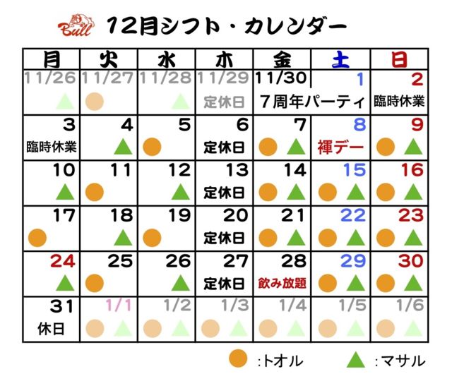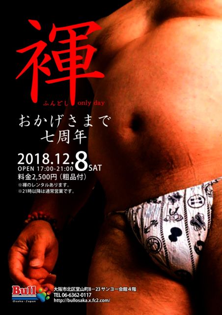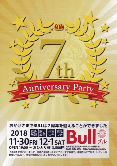 11月も駆け足で過ぎ、冬将軍到来の12月を迎えますね。 Bull 感謝の7周年パーティー 11月30日(金)12月1日(土)19時〜 飲み放題 弁当・粗品付き 12月2日(日)3日(月)臨時休業 毎週の平日(月・火・水)9時までお得な早割 2,000円 ショットコース 3杯+お通し ボトルキープコース 割物フリー+お通し ボトルキープ千円引き 感謝の褌デー7周年パーティー 12月8日(土) 17時より21時まで褌オンリー 2500円飲み放題(粗品付き) 21時以降通常営業 12月28日第4金曜恒