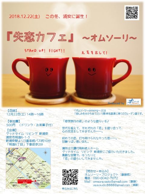 ¡Áº§³è¤äÎø³è¡¢¼ñÌ£³è¤Ë·Ò¤¬¤ë¿·¤·¤¤½Ð²ñ¤¤¤ò¸«¤Ä¤±¤è¤¦¡Á Æü»þ¡¡12·î11Æü¡¡²ÐÍËÆü »þ´Ö¡¡19:30¡Á21:30 ¾ì½ê¡¡ÅÚ´ÖÅÚ´Ö¡¡ÇðŹ ÀéÍÕ¸©Çð»ÔÇ𣲡ݣ¹¡Ý£±£·¡¡¶¦±É¥Ó¥ë¡¡3£Æ »²²ÃÈñ¡¡¡¡ ÃËÀ¡¡6500±ß¡¡½÷À¡¡3000±ß ¢¨»²²ÃÈñ¤Ë¥³¡¼¥¹ÎÁÍý¡Ü°û¤ßÊüÂê¹þ¤ß¤Ë¤Ê¤ê¤Þ¤¹¡£ ¢¨»²²ÃÈñ¤ÏÅöÆü¸½¶â¤Ç»Ùʧ¤¤´ê¤¤¤Þ¤¹¡£ »²²ÃÂоݡ¡ ÃËÀ¡¡37ºÍ¡Á55ºÍ¡¡½÷À¡¡37ºÍ¡Á55ºÍ ǯÎð¤Ï¿¾¯¤ÎÁ°¸åOK ¿Èʬ¾ÚÌÀ½ñ(Ìȵö½ñ¡¢Êݸ±¾Ú¤Ê¤É̾Á°Ç¯Îð¤Î¤ï¤«¤ë¤â¤Î)Ä󼨢¨ÃËÀ¤Î¤ß Ê罸¿Í¿ô¡¡ ÃËÀ¡¡2̾¡Á6̾¡¡ ½÷À¡¡2̾¡Á6̾ »²²Ã¾õ¶·¡¡ ÃËÀ