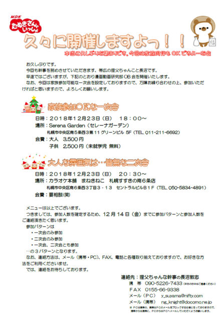 ¡¡¤ªµ×¤·¤Ö¤ê¤Ç¤¹¡£ ¡¡º£²ó¤â´´»ö¤ò̳¤á¤µ¤»¤Æ¤¤¤¿¤À¤¤Þ¤¹¡¢ÂÓ¹¤ÎìÉã¤Á¤ã¤ó¤³¤ÈĹ¾Â¤Ç¤¹¡£ ¡¡ÁᮤǤϤ´¤¶¤¤¤Þ¤¹¤¬¡¢²¼µ¤Î¤È¤ª¤êÌ¡²èư²è¸¦µæÉôOB²ñ¤ò³«ºÅ¤¤¤¿¤·¤Þ¤¹¡£ ¡¡¤Ê¤ª¡¢º£²ó¤Ï²È²»²²Ã²Äǽ¤Ê°ì¼¡²ñ¤òÀßÄꤷ¤Æ¤ª¤ê¤Þ¤¹¤Î¤Ç¡¢Ëü¾ã¤ª·«¤ê¹ç¤ï¤»¤Î¾å¡¢»²²Ã¤¤¤¿¤À¤±¤ì¤Ð¤È»×¤¤¤Þ¤¹¤Î¤Ç¡¢¤è¤í¤·¤¯¤ª´ê¤¤¤·¤Þ¤¹¡£ ¡¡²È²»²²Ã£Ï£Ë¤Ê°ì¼¡²ñ ¡¡¡¡Æü»þ¡§£²£°£±£¸Ç¯£±£²·î£²£³Æü¡ÊÆü¡Ë¡¡£±£¸¡§£°£°¡Á ¡¡¡¡¾ì½ê¡§Serena Garden¡Ê¥»¥ì¡¼¥Ê¥¬¡¼¥Ç¥ó¡Ë ¡¡¡¡¡¡»¥ËÚ»ÔÃæ±û¶èÆî£µ¾òÀ¾£³Âè11¥°¥ê¡¼¥ó¥Ó¥ë 5F ¡¡¡¡¡¡TEL. 011-211-6692 ¡¡¡¡²ñÈñ¡§Âç¿Í