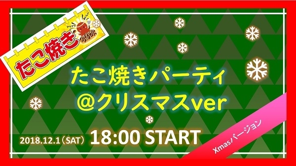 ■今回のコンセプトについて ・タコパを行いながら自然と仲良くなっていきましょう♪ ・クリスマスらしく、ゲーム大会あり!プレゼントあり!の企画です♪ ■開催会場様の情報 会場名:THE CIRCLE 住所:香川県高松市亀井町11ー10ー3階 ■当日のタイムスケジュール 17:30〜18:00 受付店舗での受付 (※時間に余裕をもってお越し下さい) ↓ 18:00〜 イベントスタート (※一斉に乾杯を行います) ↓ 18:30〜 席替え等 (※時間毎に席替えを行いながら全員の方とご歓談して頂きます!) ↓ 20:00
