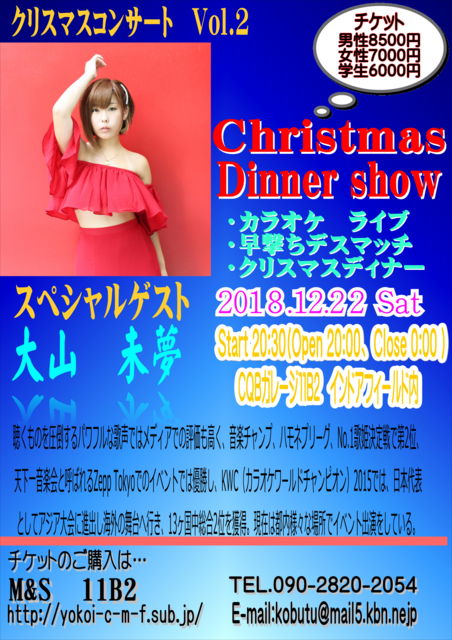 皆様、日頃よりM&S11B2 をご愛顧頂きまして、誠に有難うございます。 今年もクリスマスコンサート&忘年会を高松CQBガレージで行います。 イベント内容は、 スペシャルゲスト 大山 未夢 様によるコンサート 早撃ち デスマッチ となっております。 今回のスペシャルゲストの大山未夢 様は、 聴くものを圧倒するパワフルな歌声ではメディアでの評価も高く、音楽チャンプ、ハモネプリーグ、No.1歌姫決定戦で第2位、天下一音楽会と呼ばれるZepp Tokyoでのイベントでは優勝し、KWC(カラオケワールドチャンピオン)2015では、日本代表と