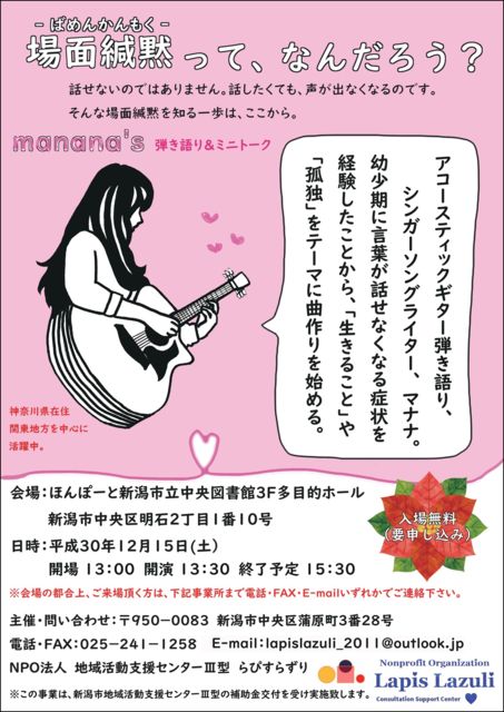 告知失礼します。 12月15日(土)新潟で場面緘黙をテーマにした音楽イベントを開催することになりました 前半が弾き語りライブ、後半がインタビュー形式のトークになります。 当事者・経験者の方はもちろん、場面緘黙に関心のある方はぜひお越しください 『場面緘黙って、なんだろう? 〜manana's 弾き語り&ミニトーク〜』 【日程】 2018年12月15日(土) 【会場】ほんぽーと新潟市立中央図書館 3F多目的ホール ※新潟駅 徒歩10分 【時間】 開場 13:00 / 開演 13:30 (終了予定 15:30) 【料金】 入場無料(要申し込み) 【出演