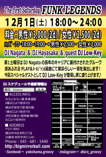 ¡úDISCO Groovy Ëè·îÂ裱ÅÚÍËÆü¤Ï¡ª¡ú ¥Ï¥Þ¤Î½ÅÄáÔDJ Nagata¡Õ¤Ë¤è¤ëÄê´ü¥¤¥Ù¥ó¥È¡ÚFUNK LEGENDS¡Û Ĺǯ¤Î¥¥ã¥ê¥¢¤Ë΢ÉÕ¤±¤µ¤ì¤¿¥°¥ë¡¼¥ô´¶¤¢¤Õ¤ì¤ë Music Video ±ÇÁü¤â¸ò¤¨¤Ê¤¬¤é¤Î DJ PLAY ¤ò¤É¤¦¤¾¤´´®Ç½¤¯¤À¤µ¤¤¡ª º£²ó¥¹¥Ú¥·¥ã¥ë¥²¥¹¥È¤È¤·¤Æ¡ÚDJ Low-Key¡Û¤¬Åо줷²£ÉͤÎÅÚÌë¤ò¹¹¤Ë¥À¥ó¥µ¥Ö¥ë¤ËÀ¹¾å¤²¤Þ¤¹¡ù ¡Ú²»³Ú¡Û¥ª¡¼¥ë¥¸¥ã¥ó¥ë / ¥ª¡¼¥ë¥ß¥Ã¥¯¥¹ Dance Classics¡¢Soul¡¢Funk¡¢R&B¡¢Hip-Hop¡¢EDM¡¢Eurobeat¡¢House¡¢etc... ¡Ú³«ºÅ»þ´Ö¡Û 18¡§00¡Á24¡§00 ¡Ú¥Ï¥Ã¥Ô¡¼¥¢¥ï¡¼ÎÁ¶â / 18:00¡Á19:00¤Ë¤´ÍèŹ¤ÎÊý¡Û ¡üÃËÀ¡§¡ï2,50