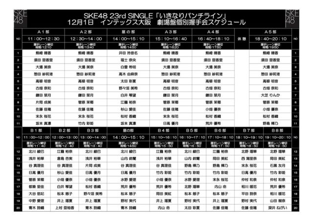 ³§¤µ¤Þ¡¢Æü¤´¤í¤è¤ê·§ºêÀ²¹á¤µ¤ó¤Ø¤Î±þ±ç¤¢¤ê¤¬¤È¤¦¤´¤¶¤¤¤Þ¤¹¡£ 12·î1Æü(ÅÚ)¤Ë³«ºÅ¤µ¤ì¤Þ¤¹ SKE48 23rd ¥·¥ó¥°¥ë¡Ö¤¤¤¤Ê¤ê¥Ñ¥ó¥Á¥é¥¤¥ó¡× ·à¾ìÈ× È¯ÇäµÇ°Âç°®¼ê²ñ ¡÷¥¤¥ó¥Æ¥Ã¥¯¥¹Âçºå¤Ë¤ª¤¤¤Æ ·§ºêÀ²¹á¤µ¤ó¤Î¥Õ¥¡¥ó¥ß¡¼¥Æ¥£¥ó¥°¤ò¹Ô¤¤¤Þ¤¹¡£ =============================== ¢£³«ºÅ»þ´Ö¡§18»þ10ʬ¡ÊͽÄê¡Ë ¤¯¤Þ¤Á¤ã¤ó¤¬»²²Ã¤¹¤ë°®¼ê²ñ¤ÎÉô¤Ï ¡¦A1Éô¡¦¡¦¡¦¡¦11¡§00~12¡§30¡Ê12¡§10¼õÉÕ½ªÎ»¡Ë ¡¦A2Éô¡¦¡¦¡¦¡¦12¡§30~14¡§00¡Ê14¡§10¼õÉÕ½ªÎ»¡Ë ¡¦A3Éô¡¦¡¦¡¦¡¦15¡§10~16¡§40¡Ê16¡§20¼õÉÕ½ªÎ»¡Ë ¡¦A4Éô¡¦¡¦¡¦¡¦16¡§40~18¡§10¡Ê17¡§50¼õ