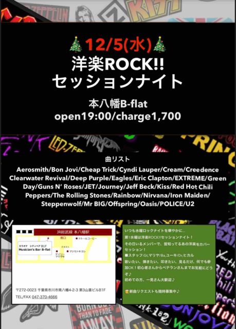 すっかり寒くなってきましたね! ギタースタッフのマリヤです✨ 洋楽ロックナイトでホットに盛り上がりましょーう\(^o^)/ 【12/5(水)洋楽ROCK!!セッションナイトvol5】 本八幡B-flat 19:00open/charge1.700(+1D) BON JOVI好きですか? DeepPurple演奏したことありますか? Guns N' Roses聞きますか? 洋楽好きですか? いつもはJPOP多めのビーフラットだけど 洋楽ロックやってもいいんじゃない!? ✳新曲リクエスト受付中!!メッセージ、コメントへどうぞ✋ 常連さん優遇です♪ リスト外でもお客さん同士で演奏するのも大歓