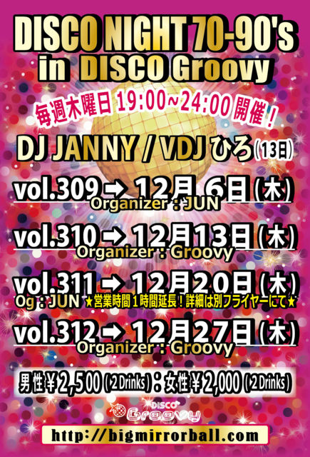 12·î¤âËè½µÌÚÍËÆü¤Ï¡ª ¤ª¤Ê¤¸¤ß¥æ¡¼¥í¥Ó¡¼¥È¿¤á¤Î¥Ç¥£¥¹¥³¥Ê¥¤¥È¢ö 70ǯÂå¤ÎSOUL¥ß¥å¡¼¥¸¥Ã¥¯¤«¤éºÇ¿·¤ÎEDM¤Þ¤Ç¥ª¡¼¥ë¥Ò¥Ã¥È¥á¥É¥ì¡¼¡ª Music Video¤ò¤Õ¤ó¤À¤ó¤Ë¿¥¤ê¸ò¤¼¤Ê¤¬¤éÍÙ¤ì¤ë¶ÊÀ¹¤êÂô»³¤Ç¤ªÂ£¤ê¤·¤Þ¤¹♬ ¡Ú¥ª¡¼¥¬¥Ê¥¤¥¶¡¼¡Û£Ê£Õ£Î ¡Ú£Ä£Ê¡ÛJANNY¡ÊMAHARAJA ROPPONGI¡Ë ¡Ú²»³Ú¡ÛALL GENRE ¡ÊSOUL¡¢Ãݤλҡ¢¥À¥ó¥¯¥é¡¢EURO¡¢HI-NRG¡¢TECHNO¡¢R&B¡¢EDM¡¢etc¡Ä¡Ë ¡Ú³«ºÅ»þ´Ö¡Û 19:00¡Á24:00 ¡ÚÎÁ¶â¡Û ÃËÀ¡§¡ï2,500 / 2Drinks ½÷À¡§¡ï2,000 / 2Drinks