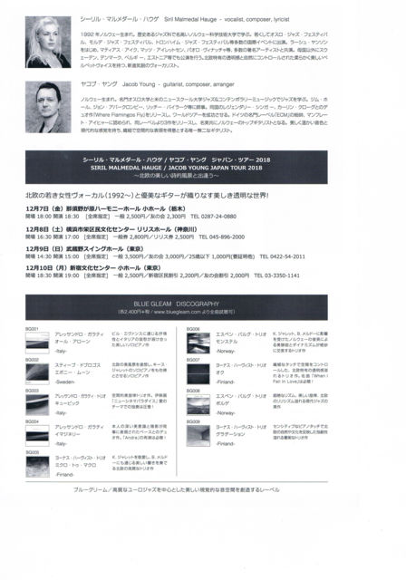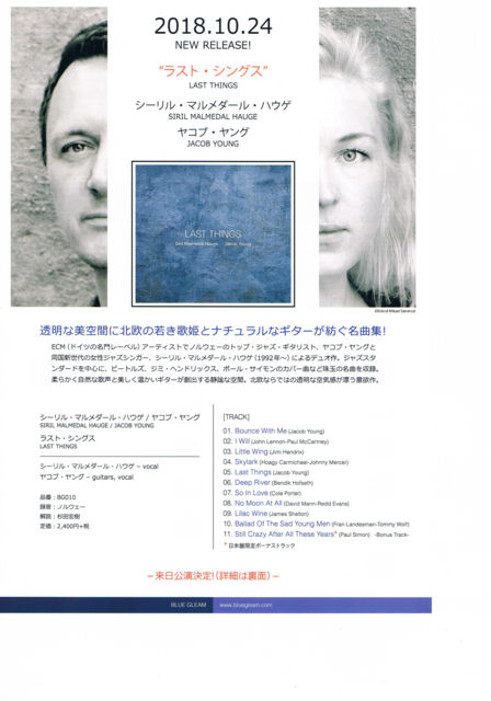 ★シーリル・マルメダール・ハウゲ/ヤコブ・ヤング新譜/公演情報★ ━━━━━━━━━━━━━━━━━━━━━━━━━━━━ 新譜リリース情報 2018 ━━━━━━━━━━━━━━━━━━━━━━━━━━━━ ECMアーティストでノルウェーのトップ・ジャズギタリスト、ヤコブ・ ヤング と同国新進気鋭の女性ジャズシンガー、シーリル・マルメ ダール・ハウゲ(26歳)によるデュオ作をリリース。ジャズスタンダ ードを中心に、ビートルズ、ジミ・ヘンドリックス、ポール・サイモン のカバー等を独自の解釈とインプロヴィゼーションにより表
