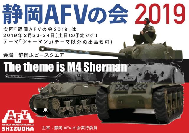 ・AFV(Armored Fighting Vehicle:装甲戦闘車両)の模型製作愛好家が製作中の模型を持ち寄り製作しながら交流する定例会です。 ・年1回開催される「静岡AFVの会」の打ち合わせも行います。 ・AFV模型に造詣深い方が参加されますので情報交換や模型製作のヒントを得る良い機会なると思います。 ●参加は事前申し込み不要。参加費無料。初心者も大歓迎です。 ●当日ホビースクエア工作室までお越し下さい。 ●製作スペースは先着20名とさせていただきます。 ●見学のみの参加も大歓迎!自由にご歓談ください。 ●組み立てるキットや工具