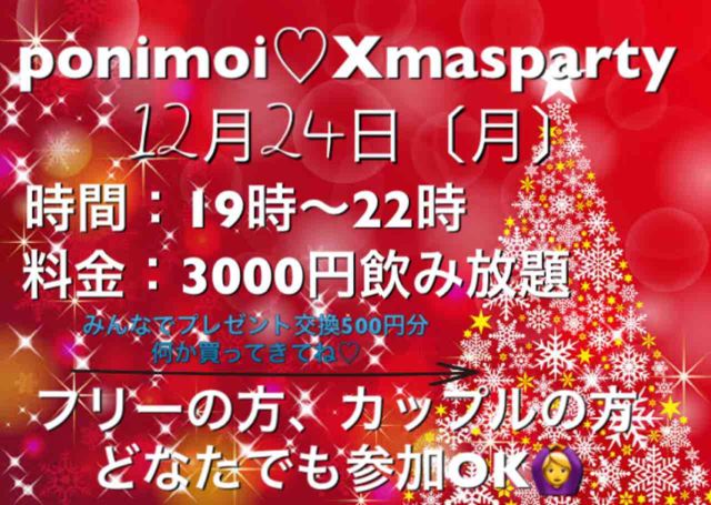 Xmasオフ会開催!! 日付:12月24日〔月曜〕 時間:19時〜2 2時 料金:3000円飲み放題+お菓子+ケーキ プレゼント交換をするので500円分でお持ちください(^^) 参加はフリーの方でもカップルでも友達とでもオッケー👌Xmasをみんなで楽しく過ごしませんか?要予約が必要なので連絡お願いします!