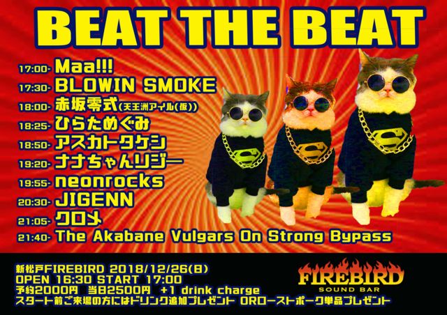 open/ 16:30 start/ 17:00 ͽÌó¡¦Á°Çä/ ¡ï2,000+DÂåÊÌ ÅöÆü/ ¡ï2,500+DÂåÊÌ (½Ð±é) JIGENN The Akabane Vulgars On Strong Bypass ¥¯¥í¥á Maa!!! neonrocks ¤Ò¤é¤¿¤á¤°¤ß ¥Ê¥Ê¤Á¤ã¤ó¥ê¥¸¡¼ ÀÖºäÎí¼°(Å·²¦½§¥¢¥¤¥ë(²¾)) ¥¢¥¹¥«¥È¥¿¥±¥· BLOWIN SMOKE ¡ý20:30¤«¤é½Ð±éͽÄê ¢¤´Í½Ìó¤Ï http://jigenn.net/postmail/postmail1226.html