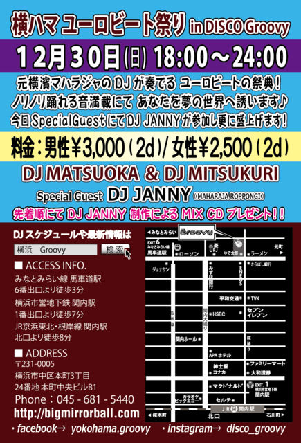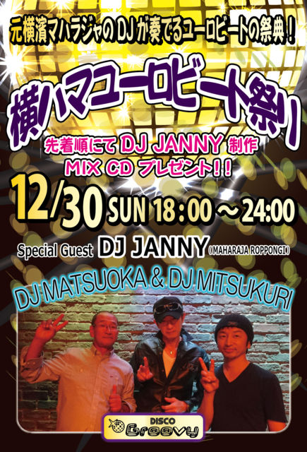 ★今回スペシャルゲストにて DJ JANNY(MAHARAJA ROPPONGI)が参加! 更にマハラジャサウンド満載にてお贈りします★先着で DJ JANNY によるオリジナルMIX CDをプレゼント! 元横濱マハラジャのDJ'sが奏でるユーロビートの祭典!ノリノリ踊れる音満載にて夢の一夜をお贈りします♪ 【DJ's】 MATSUOKA / MITSUKURI / Guest JANNY 【開催時間】 18:00〜24:00 【料金】 男性:¥3,000 / 2Drinks 女性:¥2,500 / 2Drinks