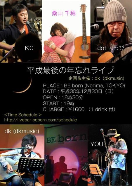 ÎýÇÏmusic & live bar BEborn ËÜÆü¡¢12·î30Æü(ÆüÍËÆü)¤Ï¡¢ ¡ÚÂßÀÚ¥¤¥Ù¥ó¥È¡Û 12:00-16:00 ¡Ú¾è¤Ã¼è¤ê´ë²è¡Û ¡ÖÊ¿À®ºÇ¸å¤Îǯ˺¤ì¥é¥¤¥Ö¡× ¼çºÅ¡§dk Ìë¤ÎÉô open 18:30 start 19:00 charge 1600±ß (1¥É¥ê¥ó¥¯ÉÕ) ¡ú19:00-19:30 KC ¡ú19:40-20:10 ·¬»³ÀéÊæ ¡ú20:20-20:50 dot ¤è¤Ã¤Ô ¡ú21:00-21:30 YOU ¡ú21:40-22:10 dk¡Êdkmusic) dk¤Î¥Ö¥í¥° 12·î31Æü(·îÍËÆü)¡Á1·î8Æü(²ÐÍËÆü) ¡ÚŹµÙÆü¡Û ¢¨¿©¤Ùʪ»ý¤Á¹þ¤ß¼«Í³¤Ç¤¹¡£ ¥´¥ß¤Ï¤ª»ý¤Áµ¢¤ê¤ª´ê¤¤¤·¤Þ¤¹¡£ °û¤ßʪ¤Ï¡¢¤ªÅ¹¤Ç¤´Ãíʸ¤ª´ê¤¤¤·¤Þ¤¹¡£ ¡ú¤ªµ¤³Ú¥é¥¤¥Ö(¥Î¥ë