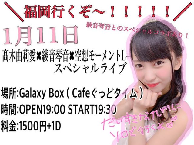 「高木由莉愛×綾音琴音×空想モーメントL+スペシャルライブ!」 日時:2019/01/11(金) 開場19:00 / 開演19:30 会場:Galaxy Box(Cafeぐっどタイム) 福岡市中央区天神3-7-3 タワーズ天神 2F 料金:1,500円 (1D別) 出演:高木由莉愛/綾音琴音/空想モーメントL+ /浅草Rainbowブリッジ福岡