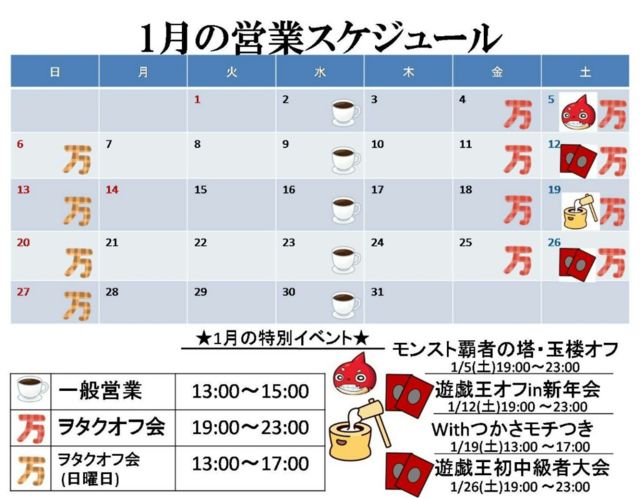 ★★万事屋オフ会スケジュール【1月】★★ ★1月・2月のイベント★ 『モンスト覇者の塔・玉楼オフ』 1/5(土)19:00〜23:00 『遊戯王in新年会』 1/12(土)19:00〜23:00 『Withつかさ餅つき』 1/19(土)13:00〜17:00 『遊戯王 初中級者大会』 1/26(土)19:00〜23:00 『遊戯王 ボックス争奪戦』 2/2(土)19:00〜23:00 ◆コンテンツ ◆ ・モンスト ・モンハンX ・コスプレ ・YouTube、ニコ動観賞 ・ボカロPV鑑賞&談義 ・遊戯王カード ・ボードゲーム ・その他いろいろ ★プロジェクター完備 ネットからの参戦も歓迎ですのでお待ちしておりまっする