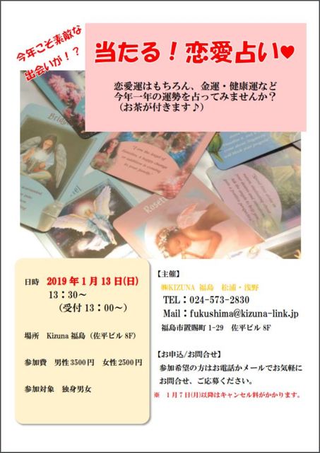 当たる!恋愛占い♡ 日時 2019年01月13日(日) 13:30〜(受付13:00〜) 場所 結婚相談所Kizuna福島支店(福島駅徒歩3分) 参加費 男性:3500円 女性:2500円 資格 男女:独身の方(先着順) 定員数 男女:各5名 内容 ★今年こそ素敵な出会いが!?★ 恋愛運はもちろん、金運・健康運など今年一年の運勢を占ってみませんか? ※お茶付きです♪ 【備考】 <申込締切>1月7日(月)までにお申込みください。 ※定員になり次第締め切らせていただきます。 ※申込締切日を過ぎてのキャンセルはキャンセル料が発生しますのでご了承