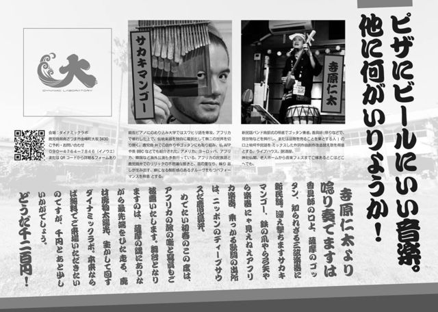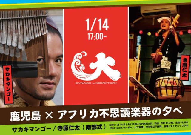 サカキマンゴー新春ライブ@ダイナミックラボ 日時 : 1月14日(金) 17:00〜(OPEN16:30) 会場 : ダイナミックラボ Tel: 0993-78-2222 南さつま市金峰町大坂3430 (旧大坂小学校) 料金 :予約¥1,200+ワンドリンクオーダー 当日¥1,500+ワンドリンクオーダー 中学生以下無料 ●●●お問い合わせ・ご予約●●● 090-4764-7846(イノウエ)または ダイナミックラボwebイベントページより受付 ※※※※※※※※※※※※※※※※※※※ お正月気分も冷めやらぬ、1月14日の日曜日。 寺原仁太より唸り奏でます