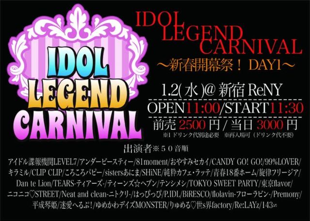¡ÖIDOL LEGEND CARNIVAL¡×〜¿·½Õ³«Ëëº×¡ªDAY1〜 Æü»þ¡§01/02(¿å) ³«¾ì11:00 / ³«±é11:30 ²ñ¾ì¡§¿·½ÉReNY ÎÁ¶â¡§Á°Çä2,000±ß / ÅöÆü2,500±ß¡Ê£±DÊ̡ˢ¨ºÆÆþ¾ì²Ä(Í×1D) ½Ð±é¡§¤Ï¤Ã¤Ô¤Ã¤Ô/TOKYO SWEET PARTY/¥Æ¥ó¥·¥á¥·/Ê¿À®¶×ɱ/¥¢¥ó¥À¡¼¥Ó¡¼¥¹¥Æ¥£¡¼/TEARS-¥Æ¥£¥¢¡¼¥º-/Neat and clean-¥Ë¥È¥¯¥ê-/SHiNE/̰¦¤Ø¤ë¤×¡ª/BiRESCO/81moment/¤ª¤ä¤¹¤ß¥»¥«¥¤/Clip Clip/¥¢¥¤¥É¥ëĵÊ󵡴ØLEVEL7/Åìµþflavor/99%LOVER/½ã¿è¥«¥Õ¥§¡¦¥é¥Ã¥Æ/143¢æ/KING¡çRAGE/CANDY GO! GO!/Dan te Lion/flolavin-¥Õ¥í¡¼¥é¥Ó¥ó-/¤æ¤á¤«¤ï¥Ç¥¤¥ºMONSTER/¥Æ¥£¡¼¥ó¥º
