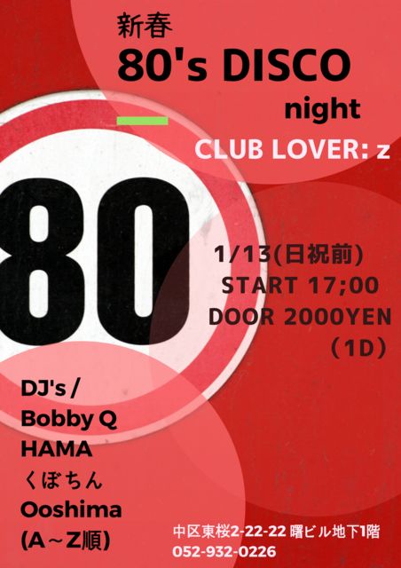 ¿·½Õ 80's DISCO SPECIAL 1/13(Æü½ËÁ°) START 17:00 DOOR 2000yen ¡Ê1D¡Ë DJ's / Bobby Q HAMA ¤¯¤Ü¤Á¤ó Ooshima (A¡ÁZ½ç)¡¡ ¤¢¤±¤Þ¤·¤Æ¤ª¤á¤Ç¤È¤¦¤´¤¶¤¤¤Þ¤¹¡ª ËÜǯÅ٤⵹¤·¤¯¤ª´ê¤¤Ãפ·¤Þ¤¹¡£ ¿·Ç¯½é¤ò¤É¤ê¤Ï¥é¥Ð¡¼¥º¤Ç¡ª ¹ë²ÚDJ¿Ø¤¬½¸·ë¡ª ͼÊý¤«¤é³«ºÅ¤¤¤¿¤·¤Þ¤¹¡£ ï¤â¤¬ÃΤäƤë EuroBeat¡¢Pops¡¢Rock. New Wave¤Ê¤É¤ÎHit¶Ê¤«¤é¡¢ ¥é¥Ð¡¼¥º80sÄêÈÖ¡ª¥³¥¢¤Ê Hi-Nrg¤Þ¤Ç¤Î¡¢ 80s DISCO ¥ª¡¼¥ë¥ß¥Ã¥¯¥¹¡ª ÀèÃå20̾Íͤˡ¢DJ Ooshima Mix CD ¥×¥ì¥¼¥ó¥È¡ª ¾ì½ê¡§ CLUB LOVER:£ú ½»½ê¡§ ̾¸Å²°